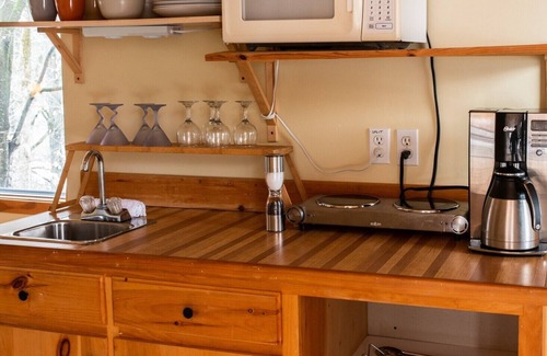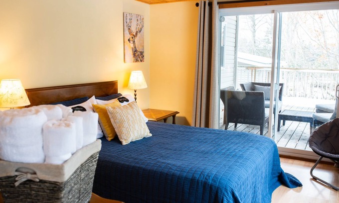 The Suite is connected to the Lodge with its own private entrance, it is winterized, and accessible year-long. The Suite can be rented on its own or as part of The Lodge. The Suite has wrap-around wide windows that give perfect views of the outdoors, and a large patio with outdoor furniture. The Suite has a Queen bed and a sofa bed as well as a kitchenette with hotplate and medium size fridge, as well as a private washroom.