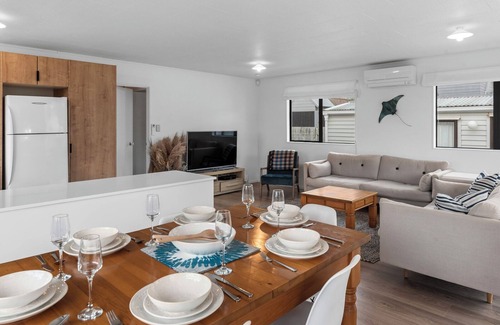 Well-equipped with outdoor seating and a BBQ, you can enjoy this peaceful spot throughout the day or head off on a North Auckland adventure. The living areas flow out to the sunny wrap-around deck adding a touch of peace to your escape.
