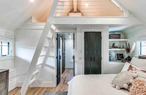 On the second floor you will find the full bathroom with great natural light plus a lighted vanity and tiled shower. The master suite boasts a view out to the courtyard, a king bed, built in shelving, a flat screen tv and cozy sleeping loft with a queen size bed. A washer and dryer are conveniently located on this level, but please don't do too many chores. You're at the lake!