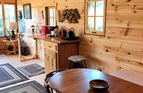 There is plenty of free parking with a 100 yard walk up to the bunkhouse nestled in the woods. We recommend you arrive during daylight hours. There is electricity, a dining area, kitchen area, log twin size bunkbed with a twin trundle, custom mattresses on the L dinette area sleeps two additional people and private area with an electric toilet and a camp shower. The bunkhouse sleeps up to 5. We provide drinking water and wash water but there is no pressurized running water at this time, so no piped shower or faucet flow but we are working on that! The soothing atmosphere of the bunkhouse will provide a peaceful retreat for your getaway. Owner has a cabin nearby on the property and is, at times, on premises should you have questions or need help with anything.