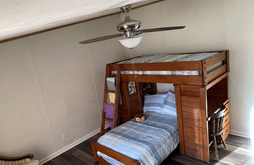 Home is furnished with a queen bed in the master suite, and there are three additional bedrooms. The house can sleep 10, but there is a strict 5 adult limit. Two of the rooms have twin bunk beds, and the final bedroom has a full size pyramid bed with bunk and trundle. A pack and play is available for children under age 2.