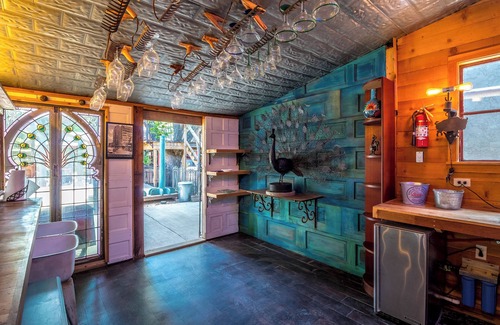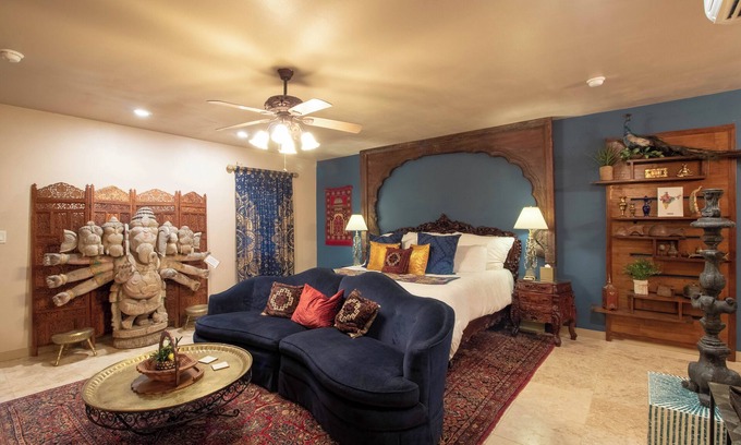 Escape to The Taj, an exquisitely themed casita inspired by the timeless elegance of the Taj Mahal. Perfect for couples seeking a serene retreat, this intimate hideaway features a luxurious king bed and a fully equipped kitchenette with a microwave, mini fridge, and Keurig—everything you need for light meal preparation.