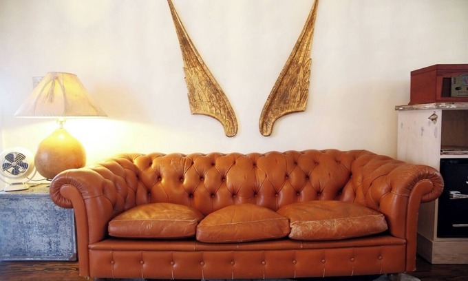 The Thunderbird Room has two queen size beds with custom made JG headboards in a neutral desert color scheme, a beaded chandelier and a vintage caramel leather Chesterfield sofa. And our original salvaged campfire art from our HGTV show is showcased in the bathroom.