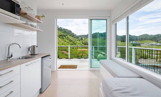 Our private cabin is only a couple of years old, it is perfect for couples or a family. It looks directly out to the hills, farmland and a slither of the ocean with lots of sunlight shining in.