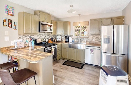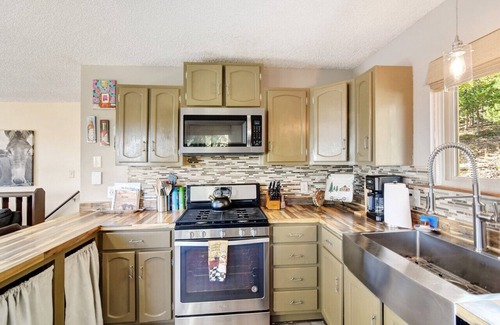 Quiet, quaint location with gorgeous, mountainous views. Hardwood floors throughout the home, 2 outdoor seating areas and a fully fenced yard. There's a large deck off the back of the house great for entertaining and stargazing at night. If you're an early riser, you can usually catch a great sunrise. The upstairs has 2 bedrooms and a pullout queen sofa. The master contains a king mattress, and the guest bedroom contains a queen mattress. The pullout sofa is located in the living area upstairs. There's also a full downstairs with a bathroom, and another bedroom with a queen mattress. Beautiful, bright kitchen with updated appliances. Quality linens are provided along with coffee and cookware.