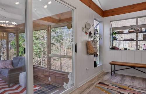 You can enter the home up the staircase to the main door. Or for people who can't do stairs, you may enter through the garage. Located on this upper level are the main living area and the master bedroom. Upon entry guests are welcomed by a large entryway with hooks for coats, benches to sit and remove their outerwear. To the left is a wonderful screened in deck with comfortable wicker seating and a partial view of the lake. To the right of the entryway lie the spacious open concept living area with vaulted ceilings and exposed wood beams. Theliving room is furnished with a large comfortable sectional and flat screen TV. The kitchen is equipped with high end stainless steel appliances and plenty of counter space including a breakfast bar. The dining area has a beautiful solid wood farmers table that seats eight. Adjacent to the kitchen/dining area is a cozy sitting area situated around the fireplace. Also on this level is a roomy master bedroom with a king bed. In addition guests will find a sizable full bathroom and a laundry room.