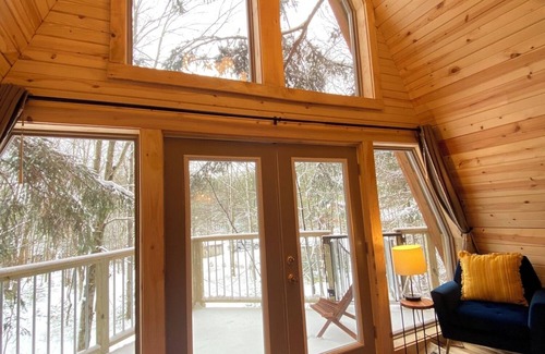 The A-frame treehouse is situated on 2 mature spruce trees, and surrounded by majestic pine trees,