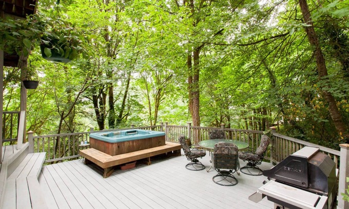 Bask in the canopy of a temperate rainforest & relax to the soothing sound of frogs, crickets and a creek as you drift off to sleep or take in the view from an LA Spas Oasis or any one of the 3 decks on this stunning Tri-level treehouse* (see details to note below) loaded with amenities: home theater w/ 100" screen, putting green w/chipping area, cavernous master suite w/ den, luxurious bathrooms, library loft with a glass ceiling^, wood burning fireplace, pool / ping pong table, BBQ & more.