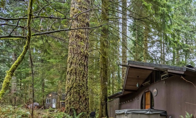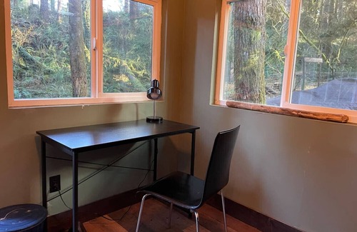 Relax and explore in two gorgeous cabins nestled amongst the trees. The treehouse has big windows looking out at the forest to your private creek. It’s a midcentury one bedroom with fireplace, reading nook, 100% organic cotton sheets, a projector, unscented eco friendly soap, a private hot tub, and fast internet. You also get access to the writer's cabin, a studio with a loft bed for additional sleep and work space, and ten acres of salmonberry and cedar forests to explore.