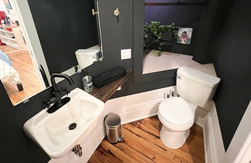 Please note that this space is above a business and below a tenant. For that reason, you will hear music from below during business hours and occasionally the tenant above. The 100 year old building itself is fairly noise permeable. While this unit is a stand alone, newly finished, private and insulated, think of it more as tenement building lodging. Additionally, our long term residents are artists, musicians and our friends. They have patios, gatherings, music making sessions and the occasional porch talk lasting into the wee hours of the morning. Some of our long term residents keep late hours regularly while others have families with young children. That being said, we have a respectful community and these varying schedules means that during the late hours, folks try their best to not keep anyone up. And of course, we ask the same of our guests.