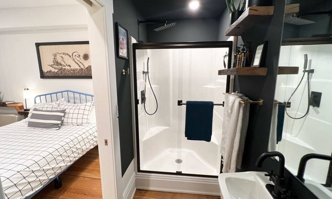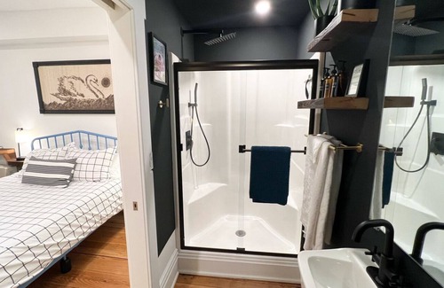 Enjoy our this private apartment for it’s rain shower head, high-speed wifi, comfy bed, on demand hot water, complimentary coffee (french press!) and full kitchen with copper countertops.