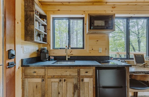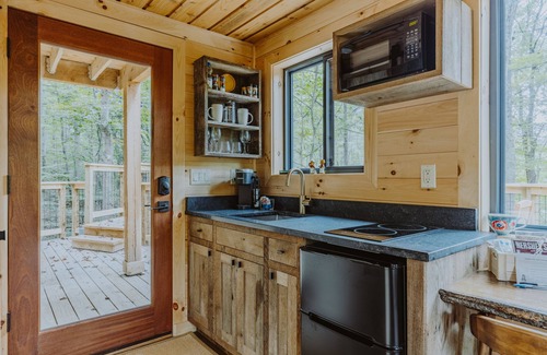 Kitchenette: dishes, glasses, and utensils for four, cookware, mini-fridge, electric 2-burner cooktop, microwave, electric griddle, basic spices, starter supply of K-cups, and ground coffee.