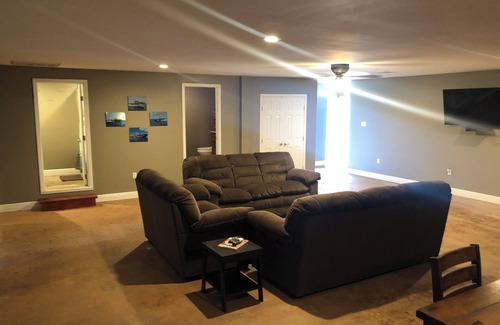 3 bedroom 2 full bathroom lodge that comfortably sleeps 6 people (everyone on a full size bottom bed) but can sleep up to 12 people (6 top twin beds). Please keep in mind if more than 6 guests stay at the lodge, there is an up charge per head, and an additional $50 cleaning fee added to the booking.