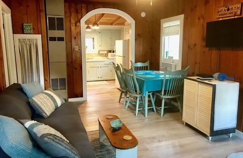 This listing is for 1 (#112 Dot) of the 2 charming Twin Cottages! They sit on private property with 55 feet of sandy lake frontage with a private dock and boat anchors. The 2 bedroom, 1 bath cottages have been freshened up from top to bottom. Dot has 2 Queen bedrooms (plus a queen sofa bed in the living room). Paper products and all linens are supplied. You will just need to bring your beach towels. Ceiling fans in both bedrooms and in the living-room - Wifi - Smart TV with Cable - 2 Fire pits are shared between the 2 cottages.