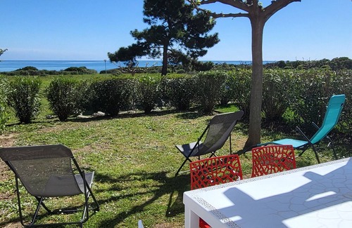 Beautiful enclosed garden with trees, terrace with sea view, equipped for meals and 2 deckchairs.