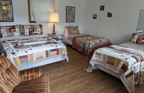 The unique layout of Evans Notch Lodge allows your group to spread out and enjoy as much privacy or togetherness as you want. Property rental includes five sleeping rooms with en suite bathrooms in the 'long house' year-round, and in warmer weather (June-mid-October) we add on two sleeping cabins with en suite bathrooms, all with their own separate entrances. The main Lodge building houses the fully-appointed kitchen and a large 'great room' with a dining area, cozy wood stove, and plenty of comfy spots to hang out.