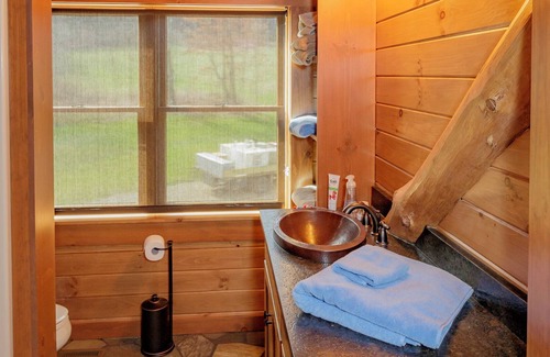 The second is the suite. This stand alone cabin sits approximately 100 feet away from the main cabin and is perfect for that couple that needs a little extra peace and quiet. The suite includes a kitchenet, queen bunk beds, and a full bathroom.