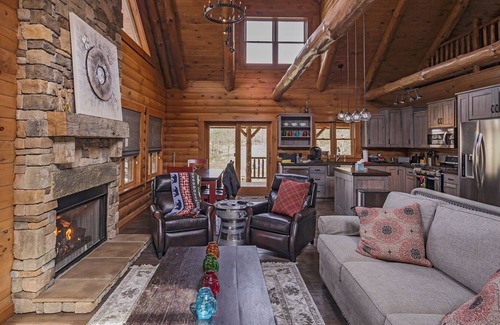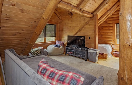 The first is the main cabin which is filled with top of the line kitchen appliances, a master suite that looks over the pond, a spare bedroom, as well as 2 twin beds in the loft. The cabin includes a fireplace, wrap around porch, and entertainment area in the loft.