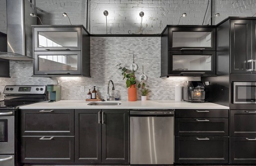 • Designer kitchen with black cabinetry, stainless steel appliances, and all the essentials