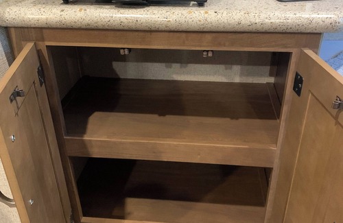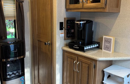 The 5th Wheel Camper sleeps 5 comfortably (6 if they are small). It has a nice island in the kitchen and a dining area. The kitchen is furnished with most of what you would need for cooking. There are reclining chairs in the living room, and a couch that folds out to a bed. There is also a full size air mattress. The Master Bedroom is a very comfortable Queen bed. There are also towels, washcloths, dish clothes, blankets, pillows, etc all included. Camp chairs for next to the fire are provided, and some outdoor lighting for the evening. No more generator!! We have it wired for electric which means more peace and quiet!