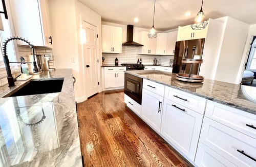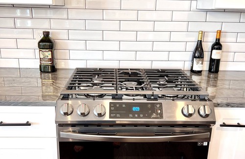 - Fully equipped kitchen: Brand new stainless steel Samsung appliances (6 burner range, oven with air fryer, microwave, fridge, dishwasher), T-Fal cookware, Henckels knives, Black & Decker toaster oven with air fry capability, Gourmia 7 qt air fryer, Keurig K-Supreme Plus coffee maker, Boden French press, blender, kettle, baking sheets, Pyrex bakingware, mixing bowls, servingware, and all the cooking utensils and supplies you may need