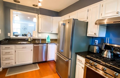 The living room, half-bath, kitchen, dining area and access to the private backyard are all on the main floor. The kitchen has a 3-door French refrigerator with icemaker, dishwasher, gas stove, microwave, Keurig coffee maker, in addition to many tools and utensils for all your in-home meal preparations.