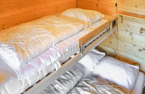 The second floor can be reached via a steep spiral staircase. Here are the 3 bedrooms (1 bedroom with bunk bed (2 x 1.80 x 0.90 m), 1 bedroom with 1 double bed (2.00 x 1.80 m) - 2 mattresses (2.00 x 0.90 m) pushed together - and a bedroom with bunk bed (2.00 x 0.90 m), of which the lower bed is 2.00 x 1.40 m and a bathroom with shower, washing machine and toilet.