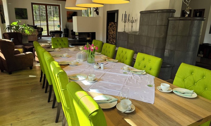 Our house is a real alternative to a first-class hotel and ideally located for families, a holiday with friends and of course for business events and seminars. It enjoys an idyllic location near the forest, surrounded by pine trees, a softly babbling brook and is admired at night and from time to time by a small deer or fox.