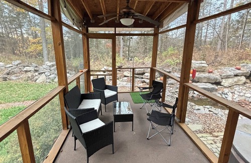 Enjoy cozy living with a comfy couch and big screen tv, en-suite bathroom, and high-speed Wi-Fi. Wind down in the hottub with tiki torches and pond.