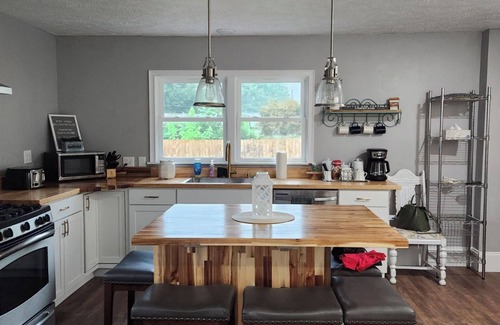 With 3 king beds, 2 queen beds, 1 full bed and 1 twin bed, there's plenty of space for all guests. Enjoy the peaceful surroundings and unwind in the Great room with a cozy futon, the classy red parlor or the upstairs game room with arcade gaming! The property also features 3 full bathrooms. Two with tubs and custom tiled surrounds as well as one boasting a 9ft+ tall walk-in shower with white marble walls! 2 hair dryers and a straightener also available for your convenience! High speed WiFi, multiple work spaces, several flat screen smart tv's including a 70" big screen in the great room! We offer many amenities including air conditioning, clothing iron, and a full size washer dryer combo all for your convenience. We are still adding more finishing touches on this brand new completely remodeled beauty! Well, what are you waiting for?! Come stay at the Vicky, and unwind!!