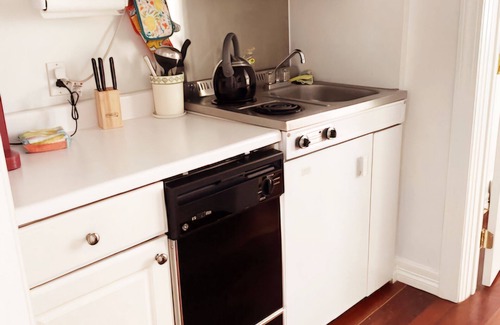 The spacious living room has an electric fireplace, cherry hardwood floors, and warm afternoon sunlight. The Cottage has a covered porch, an old fashion swing, rocking chair and private grill that overlook the rushing creek offering a peaceful location for your morning cup of coffee and evening romantic dinner. The kitchen is fully equipped . This cottage contains a queen sleeper couch sleeping a total of 4 if need.