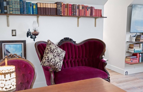 This newly remodeled one-bedroom, one-bath apartment offers a sanctuary of comfort and sophistication. As you enter, you're greeted by a cozy living space adorned with intricate Victorian furnishings and accents, complemented by the warmth of antique books lining the shelves.