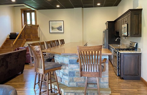Gathering Room: On the lower level of the lodge you will find a large gathering space to come together as a group. With a full kitchen and an 8 seat oversized bar, you will have plenty of room cook and eat together. The space also contains two large dining tables with cushioned chairs, couch seating, and a children’s play nook. Guests love the FuBball table. (The fireplace is usable only during a host catered event)