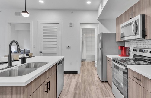 -Fully equipped kitchen with stainless appliances including a refrigerator, stove/range, dishwasher, and microwave with an oversized bar for serving meals or entertaining. Essentials included consist of cookware, Keurig pod coffee maker, houseware, linens, and more.