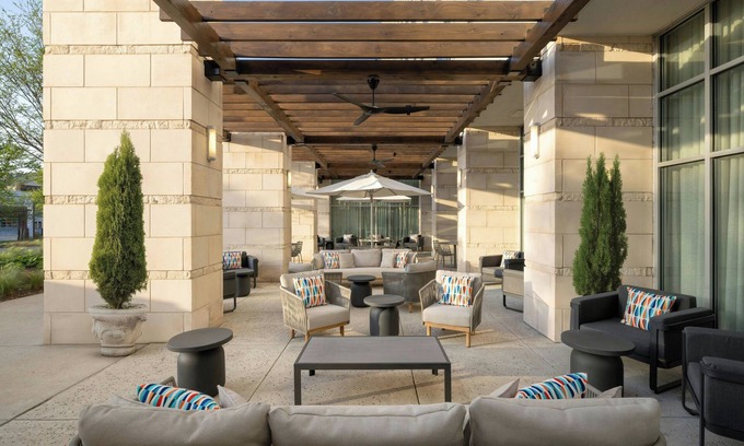 Pet-friendly hotel with an outdoor pool connected to a shopping center in Austin
