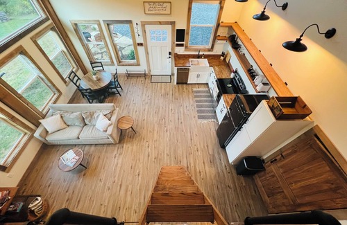 This 600 sq foot 1BR/1BR barn apartment was built in 2024. The 16+ foot tall ceilings, numerous windows and spacious loft add openness and space to the living area. The master bedroom has a comfortable queen-sized bed, spacious armoire and designated workspace complete with desk and office chair. The couch in the living room easily converts to another queen sized bed for extra guests (we just recently added a brand new memory foam mattress for the sofa bed!)- all linens, pillow and mattress topper provided. The living room has a Roku TV for streaming your favorite shows. Board/card games and puzzles are provided for your entertainment. All linens and towels are provided. The loft space can be used as storage or as another extra living space. Currently it functions as a kids playroom with some kids toys, a rug, two rocking chairs and a large TV. Our spacious bathroom has plenty of storage shelving, a custom roll-in subway tile shower, and a beautiful floating vanity built from Sassafras wood. The full sized, well-equipped kitchen is ready for you to cook your meals and is complete with a full-sized fridge and oven/stove and a drip coffee maker with our provided coffee. There is also a hot water kettle provided if you prefer to drink tea. Outside you will find a shared patio space (shared with Apartment A) with adirondack chairs and a smokeless fire pit overlooking the farm and Smoky Mountain views- wood, fire starter logs, and roasting sticks provided.