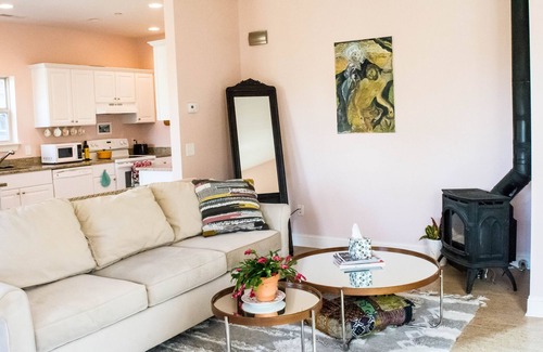 Relax with family or work remotely while nestled up to national forest, just outside of town. Cozily outfitted with all you need to relax, cook, sleep peacefully, read, write, practice yoga, or make music on the piano. Watch the sunset, stargaze from the balcony, watch TV, hike, cook a dinner, or relax by the fire. With soothing tones and surrounded by trees, this cabin with clean lines is tucked away from it all.