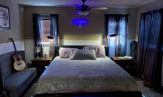 We have a unique and cool secret in town. Our tiny house may help to get your creative juices flowing with a guitar waiting to be played. The music played here is your secret, what you play there stays there. Our tiny home offers a big Bang for your buck! It has high speed internet, a full kitchen, dining area, bathroom and instant hot water!