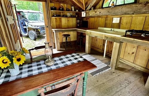 Outdoors you have a large sized fireplace and plenty of firewood to burn with tree stump seating. We provide plenty of cast iron cookware for a real backwoods country meal. There is a picnic table and up to 10 gallons of potable water. The east side of the cabin has a solar shower (bring your own towels)