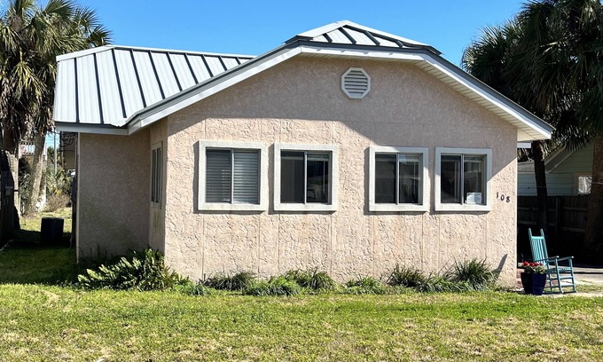 Our home-away-from-home is within walking distance of beautiful, white-sand Laguna Beach. No condos blocking your view. Watch the dolphins and rays when the water is calm. Boogie board or body surf when there are waves. Fish, build sand castles, collect shells and sand dollars with the kids. Stroll along the shore or run if you like. There's lots of room. Our sunsets are spectacular! If you're hungry or just want a snack, Thomas' Donut and Ice Cream shop is just around the corner. If you are looking for a faster pace, Pier Park is just a few miles away. Lots of stores to pick up souvenirs and things you need. Fish off the pier or rent scooters or jet skis. There are restaurants, bars, movies, and rides; and also night clubs if you want to dance. The peach stucco house has been in our family since the 1960s. We remodeled it in 2014 so it's up to code and has all the amenities; new stove, refrigerator, dishwasher, microwave and coffeemaker. There are spices, dishes, flatware and pans if you want to cook. The main room has a cable tv, dvd, Amazon Prime and Roku, and plenty of seating. It is an open floor plan so you can see the eat-in kitchen. There is a washer and dryer in the utility room. If you want you can still hang your beach towels on the line. Bedroom #1 has a queen bed and its own bathroom with tub/shower. Bedroom #2 also has a queen bed. Bedroom #3 has 2 twin beds and a tv to entertain the kids. The back bathroom has a shower. The front porch has additional seating areas and has a futon that sleeps 2 so the house sleeps 8 comfortably, and both couches are comfortable for sleeping. The back yard is spacious. There is plenty of room to play or relax in. The driveway/patio on the side is where we usually grill and sit out because it gets shade and a breeze. There are chairs in the storage shed with the beach chairs, umbrellas and beach toys.