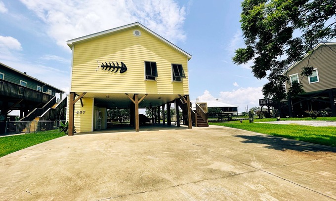 Enjoy a spacious open floorplan with all the conveniences of home and many more. This 3 bedroom with 2.5 baths features a very modern open floorplan that sleeps 12 guests. A fully stocked kitchen lets you enjoy cooking and entertaining whether inside or outside on the back porch. Have your morning coffee with the sunrise or your evening grilling into the sunset with the beautiful view while leaning over the rail asking all the returning boats "What Y'all Caught". Boat lifts downstairs with additional docks and fish cleaning facilities. If you choose to have a guided trip, pick up is available dockside downstairs.