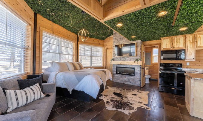 Welcome to The Yurt, a charming and cozy escape designed for comfort and simplicity. The main floor features an open concept with a kitchen and living room, where you’ll find a true king bed, TV, and bathroom for your convenience. Relax in comfort while enjoying the modern amenities in a stylish, minimalist setting.
