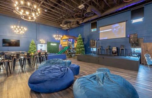 Make some memories at this unique and family-friendly place. We have several 7-foot bean bags, two comfy modular sofas, and floor space for sleeping bags! It can sleep 30 people! The space features a stage, a movie theatre projector, 2 smart TVs, an Xbox, a tree house WITH VIDEO GAMES and a SLIDE that leads into a ball pit. Perfect for a family gathering, girls weekend, etc.! There are also two bathrooms with showers, a full kitchen, and coin laundry all in the same building.