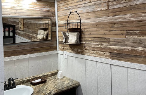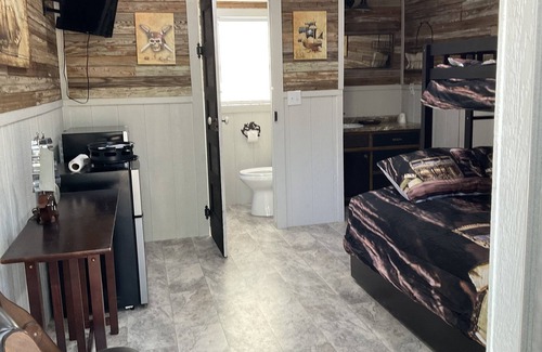Theme cabin on wooded lot quiet , but 1 mile 1/4 to Winn star . And Gainesvilletx it has micro ,wave fridge, twin over queen bunks. Private bathroom . Deck to under the trees to enjoy watching wildlife.