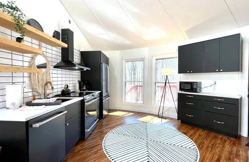 Entry is in the kitchen and dining area opening to the living room. Off the open concept area are two bedrooms and a full bathroom. One bedroom offers 2 bunk beds (sleeps 4) and the other bedroom offers a queen bed. Down the hall you'll find a private master suit with private wood burning stove, sitting area, private master bath with soaking tub and separate shower, and private access to a deck with privacy and wooded views.