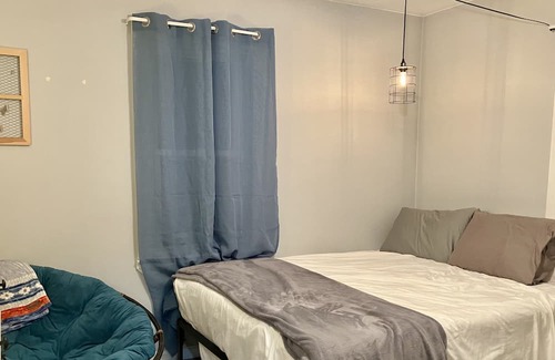 This charming 2 bedroom 1.5 bathroom is perfect for anybody no matter what they are visiting for. Private backyard that is half fenced in, but it also sits on the edge of the woods line, for a peaceful, quiet stay. In the summer time, there is a above ground pool, seating area, gas burning grill, and a fire pit for those warm summer nights.