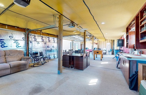 Step inside and you'll find a fully stocked kitchen ready for all your culinary adventures, a cozy living room with a TV for movie nights, and a game room that's sure to spark some friendly competition. After a day of fun, snuggle up in the queen bed with provided linens and towels for a blissful night's sleep. Plus, with handy amenities like a hair dryer, iron, and washer/dryer, everything you need is at your fingertips.