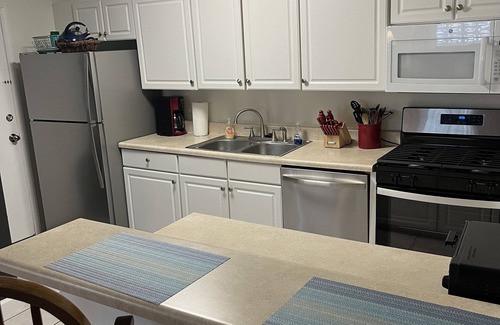 The ground level condo is a two bedroom/1 bathroom. Each bedroom has a walk in closet, queen bed, chest of drawers. The kitchen is fully furnished with dishwasher, gas stove, microwave, and dishes.