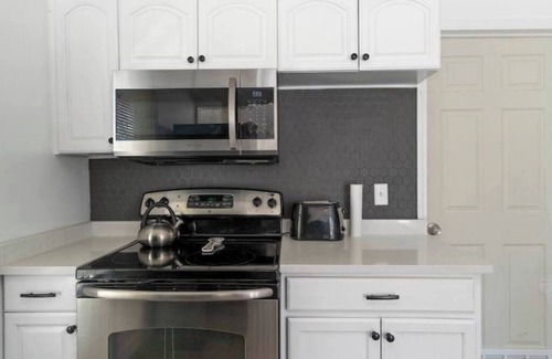 Our fully equipped and stunning kitchen boasts stainless steel appliances, utensils, and kitchen gadgets. You'll find everything you need from a toaster and gourmet knife set to paper towels and more. Whip up your favorite meals and snacks with ease.