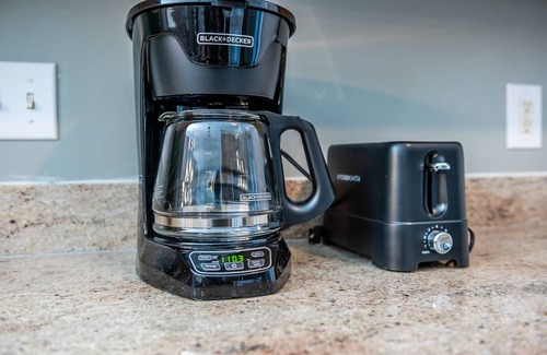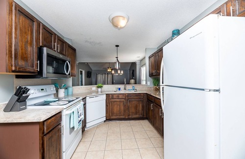 The Kitchen is fully ready to go with a refrigerator, range, microwave, Keurig, dishwasher, silverware, plates, bowls, and basic cooking tools.